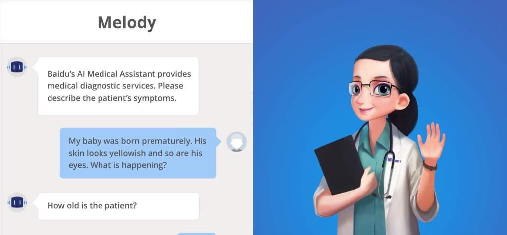 Китайский поисковик Baidu разработал специализированный цифровой продукт - медицинский виртуальный ассистент Melody, который предназначен для помощи при общении врача с его пациентами. Это приложение работает как посредник между врачом и пациентом и использует алгоритмы машинного обучения для того, чтобы помочь врачам собирать информацию от пациента о его физическом состоянии и симптомах, а также помогать точнее установить диагноз.