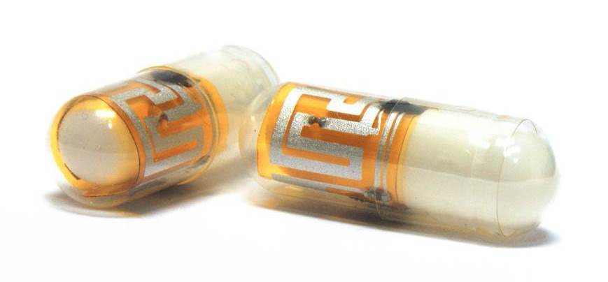 Одно из таких решений, разработанное американской компанией etectRx и получившее название ID-Cap, сейчас проходит клинические испытания. Оно представляет собой капсулы с лекарством, которые содержат внутри себя миниатюрное электронное содержимое и химические агенты, обеспечивающие своевременное высвобождение лекарства в желудке и выдачу наружу сигнала с информацией об этом. Когда капсула растворяется в желудке и выделяет лекарство, оно посылает очень слабый радиосигнал, который получает небольшое считывающее устройство, которое пациент носит с собой. Этот ридер затем с помощью Bluetooth отправляет соответствующее сообщение в специальное приложение на смартфоне пациента. Приложение, в свою очередь, информирует о приеме лекарства врача пациента, отсылая данные в облачную платформу управления информацией. Питание электроника капсулы получает за счет взаимодействия с жидкостью, содержащейся в желудке, двух инертных материалов в капсуле. Этого вполне достаточно, чтобы отослать единичный сигнал о том, что лекарство поглощено.