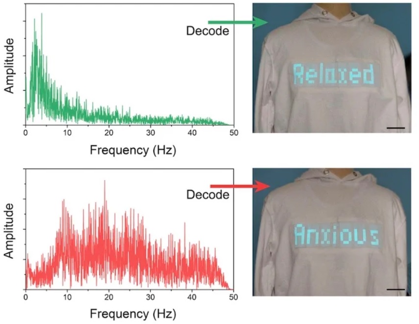 Интересное решение нашла и группа исследователей, которая недавно создала тип электронного текстиля, способного “общаться” и подавать электричество на дисплей. Система разработана для людей с проблемами голоса или речи. Общее ключевое слово о психическом состоянии человека после декодирования сигналов электроэнцефалограммы высвечивается у него на одежде.