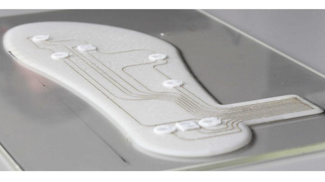 Затем они печатают проводники на этом первом слое с помощью проводящих чернил, содержащих серебро. Потом они печатают датчики на проводниках в отдельных местах, используя чернила, содержащие сажу. Датчики распределяются не случайным образом: они размещаются именно там, где давление подошвы стопы наиболее сильное. Чтобы защитить датчики и проводники, исследователи покрывают их еще одним слоем силикона.