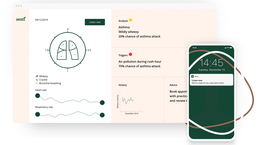 "Умная" футболка Senti содержит встроенные в нее малозаметные сенсоры, которые слушают звуки, издаваемые грудью пользователя во время сна, обеспечивая таким образом переход от моментального считывания показаний с помощью стетоскопа к непрерывно отслеживаемому, богатому данными обзору состояния здоровья грудной клетки человека.