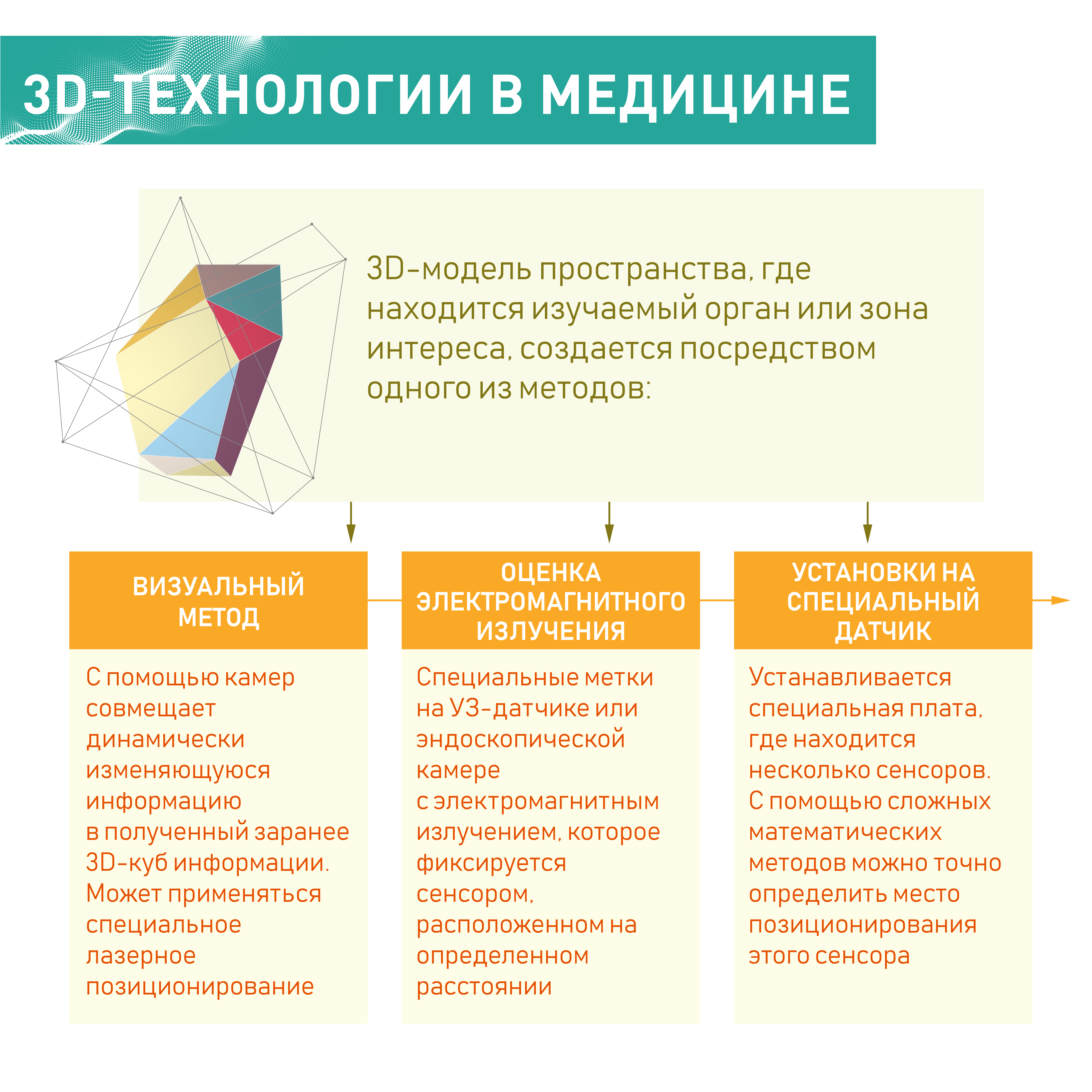 Первый метод – это визуальный метод, который позволяет с помощью специальных камер, направленных на зону интереса, совместить динамически изменяющуюся информацию в полученный заранее 3D-куб информации. При этом может применяться специальное лазерное позиционирование. К примеру, у эндоскопической камеры имеются специальные 3D-метки, которые отражают информацию, и с помощью замера расстояний, которые проходит отражаемый луч, можно точно позиционировать в 3D-пространстве датчик.