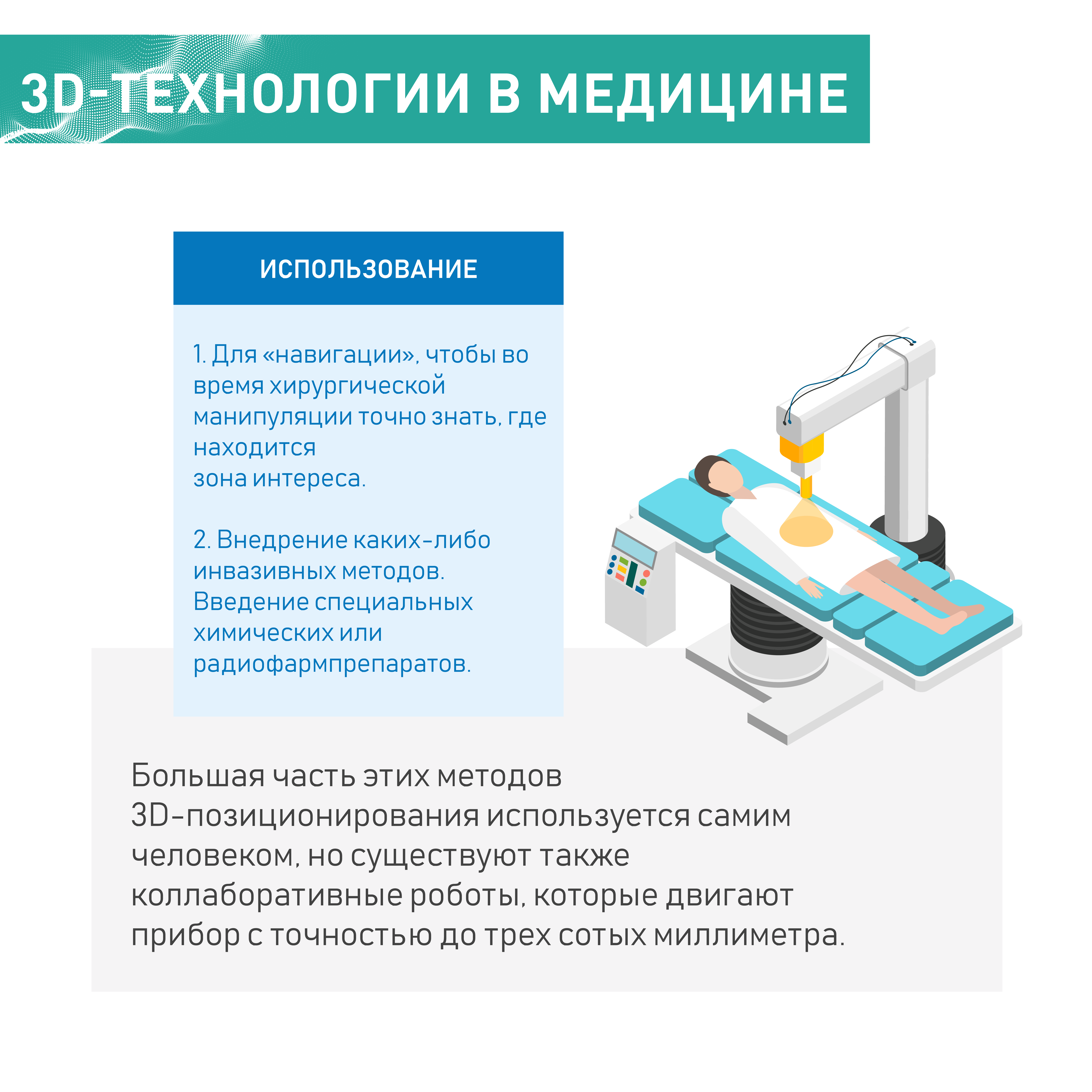 Большая часть этих методов 3D-позиционирования используются в ручном режиме, когда сам человек берет, к примеру, сенсор, ультразвуковой датчик или эндоскопическую камеру и начинает ее двигать. В 3D-пространстве она движется, а мы видим по полученной заранее информации с помощью компьютерной томографии или иного метода, где находится, к примеру, зона нашего интереса, кончик иглы, кончик эндоскопической камеры. Далее человек сам в ручном режиме управляет этим процессом. Однако современные технологии с использованием роботической техники позволяют это еще более автоматизировать. Есть так называемые коллаборативные роботы - у нас есть отдельный обзор возможностей коллаборативных роботов в медицине.