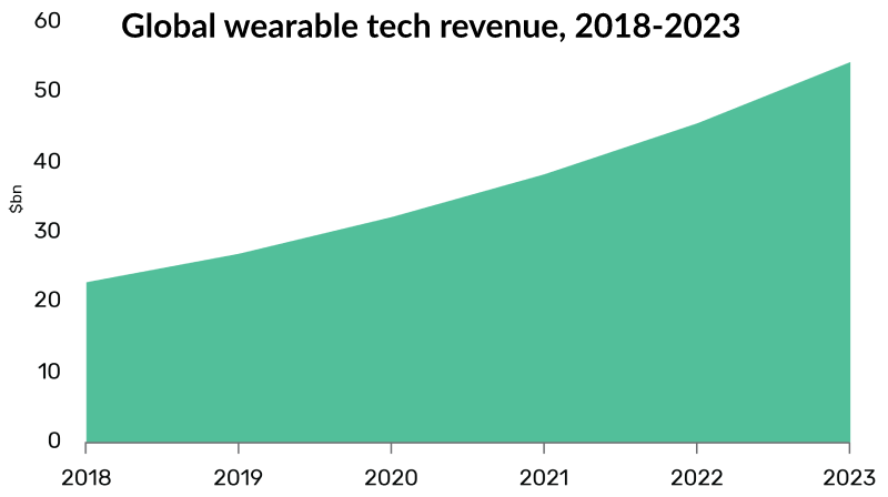 Как отмечается в отчете аналитической компании GlobalData, в 2018 году рынок носимых технологий оценивался почти в $23 млрд, при этом, по прогнозам, будет расти с ежегодным темпом роста в 19%, достигнув $54 млрд к 2023 году.