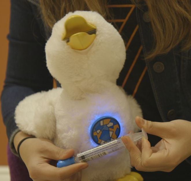 Пушистый робот имеет даже устройство для внутривенного доступа с чипом RFID, чтобы дети могли как бы проводить химиотерапию своему утенку такую же, как получают они сами. Такая игра помогает детям справляться с трудностями своего лечения, заставляя их чувствовать, что они проходят через лечение не в одиночку. В добавок есть еще и приложение с функцией добавленной реальности, которое расширяет возможности медицинской игры. Дети могут делать утке уколы, обтирать ее губкой, укладывать ее спать, а "птица" реагирует на эти действия.