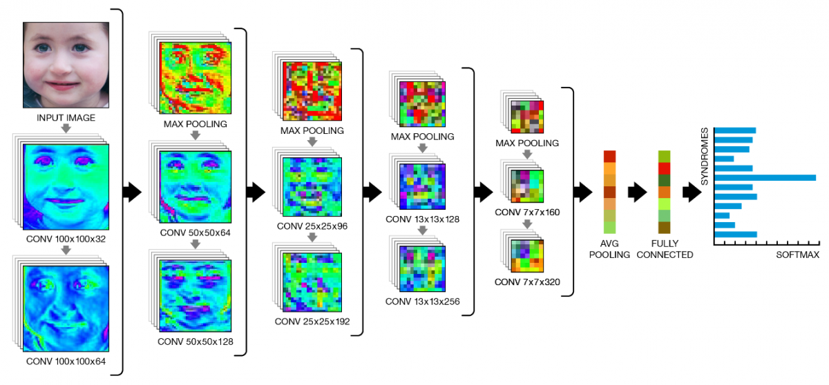 Многие генетические заболевания, такие как синдром Ангельмана* и синдром Нунан**, могут проявляться в некоторых чертах лица, таких как редко расположенные зубы или выступающий язык. Система DeepGestalt использовала глубокое обучение, чтобы научиться распознавать такие особенности на фотографиях пациентов и составлять список наиболее вероятных расстройств. В процессе глубокого изучения было обработано 17 000 изображений лиц пациентов с более чем 200 генетическими расстройствами.