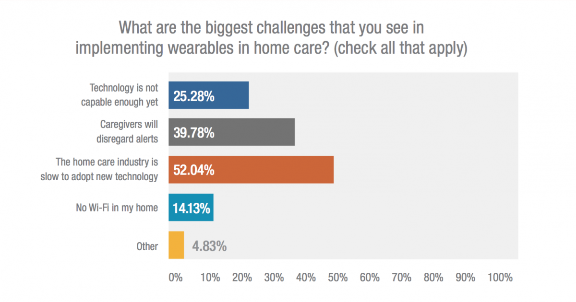 Участникам опроса задавали также вопросы о других сферах домашнего здравоохранения, где, по их мнению, носимые устройства в будущем будут играть важную роль. 52% людей считают, что это может быть система предупреждающих сигналов, которая будет сообщать службе по уходу о необычных изменениях в уровне активности их подопечных, частоте сердцебиения или температуре. 50.2% опрошенных считают, что было бы полезно, чтобы существовала система напоминания о планируемых визитах к врачу, предписаниях и рецептах, а также о времени приема пищи. 39.8% полагают, что носимые устройства при необходимости должны использоваться для отсылки сообщений в реальном времени от организации-провайдера людям, зарегистрированным как контакты на случай чрезвычайной ситуации. 39% считают, что носимые устройства должны диагностировать потенциальные проблемы со здоровьем у пользователей услуг компаний по уходу за пожилыми и больными людьми.