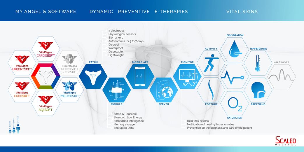 Одно из таких решений представила французская компания Scaleo Medical. Продукт этой компании - MyAngel VitalSigns - представляет собой носимое устройство, приклеиваемое на грудь с помощью липкой основы и предназначенное для непрерывного наблюдения за пациентом, находящемся в зоне риска заболевания сердечными или респираторными заболеваниями.