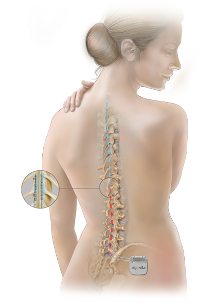 Устройство использует 24-канальный имплантируемый генератор электрических импульсов и различные, зависящие от нужд конкретных пациентов, конфигурации электродов. Мощность выходного сигнала и диапазон параметров может настраиваться, причем большая часть настройки осуществляется с помощью беспроводного внешнего программатора. Используемые в устройстве электроды могут растягиваться, кроме того они могут быть разной длины для более оптимального использования. Среди других функций Algovita: