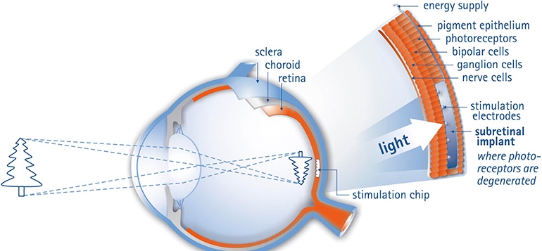 Имплантируемый чип по своей функциональности является заменой переставшей работать сетчатки, захватывая изображения множество раз в секунду и стимулируя оптический нерв, основываясь на том, что он видит. При этом не используется внешняя камера, поэтому система зрения более естественная, чем у решений, которые получают изображения окружающего мира с помощью камер. Кроме того, пациент может смотреть по сторонам просто с помощью своих глаз, а не поворачивая всю голову, чтобы изменить поле зрения.