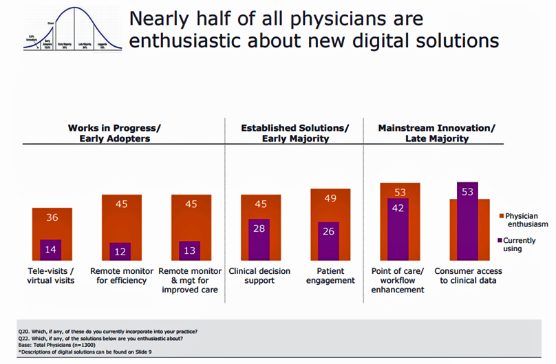 В настоящее время более половины терапевтов расширили доступ к клиническим данных для своих пациентов, а 42% используют в своей работе цифровые системы, облегчающие рабочие процессы (именно к таким технологиям с наибольшим энтузиазмом относятся врачи). Хотя решениями, вовлекающими пациентов в процесс лечения, пользуется только 26% врачей, а системами поддержки клинических решений - 28%, врачи также считают эти технологии очень перспективными. Каждый десятый врач является т.н. "ранним последователем" (early adopter) таких новых цифровых медицинских технологий, как виртуальные визиты и удаленный мониторинг здоровья. Причем к удаленному мониторингу с энтузиазмом относятся почти половина всех опрошенных врачей общей практики, к телемедицине - 30%.