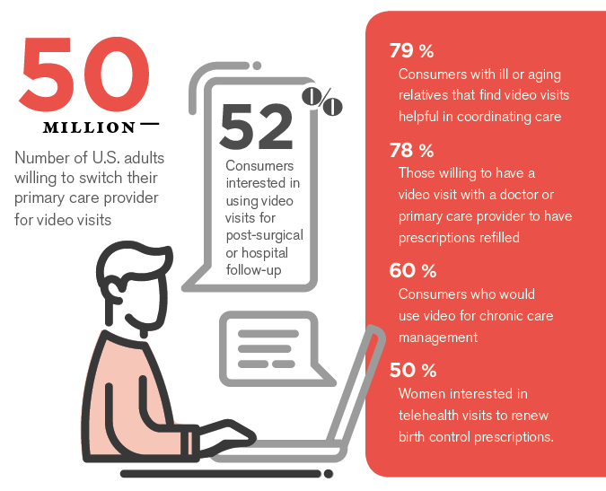 Потребителей также очень привлекает возможность использования видео-общения для послеоперационного или постбольничного контроля, ухода за старыми пациентами, получения очередного рецепта или обновления предписания по лечению. Во всех этих случаях, удобство и экономия времени очень много значат для людей, а что касается медицинского обслуживания стариков и визитов в неурочное время, то в учет принимается еще и значительная экономия, и безопасность.
