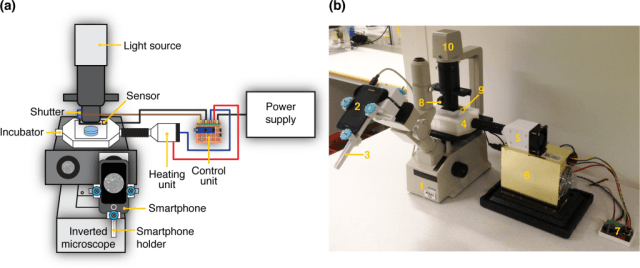 Группа исследователей из университета Упсалы (Финляндия) разработали удобную и недорогую систему, позволяющую снимать видео живых клеток при различных условиях. Дублирующая функции покадровой визуализации и инкубации, эта система может быть изготовлена из доступных электронных компонентов и напечатанных на 3D-принтере частей, используя обычный смартфон для визуализации.