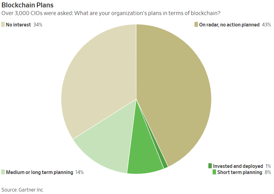 Специалисты Gartner опросили около 3150 руководителей (CIO) предприятий и только 1% из них сообщили о внедрении у себя технологии блокчейн в каком-либо виде. С другой стороны, 34% заявили об отсутствии интереса к таким проектам.