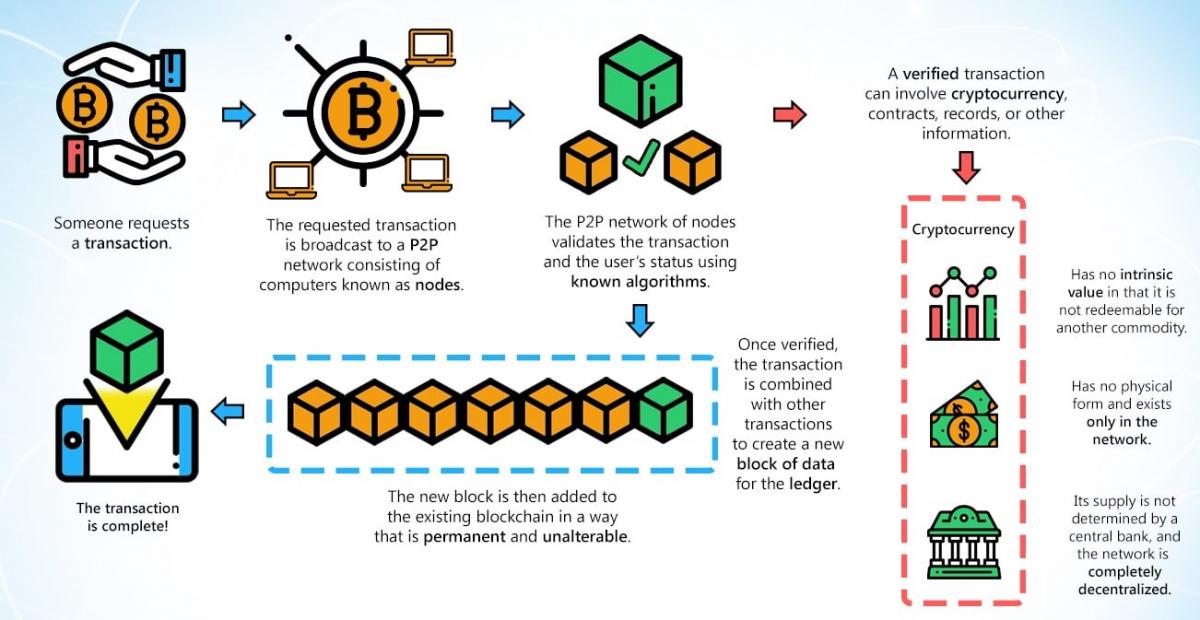 Блокчейн - это, по сути, распределенная база данных записей или публичный учетный журнал всех транзакций или цифровых событий, которые были осуществлены и совместно использовались среди участвующих сторон. В цепочке блоков содержится определенная и проверяемая запись о каждой совершенной транзакции.