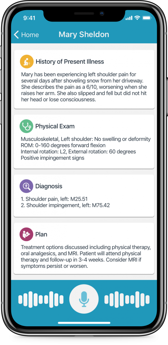 Американская компания Saykara разработала приложение для смартфона, которое регистрирует взаимодействие врача с пациентами, используя искусственный интеллект и машинное обучение, чтобы записывать ключевые моменты разговора врача с пациентом и соответствующим образом делать записи в ЭМК, оставляя врачу возможность сосредоточиться на пациенте. Благодаря режиму Ambient Mode приложение Saykara в пассивном режиме слушает, расшифровывает текст, разбивает текст на структурированные данные и заполняет каждую форму электронной медицинской карты пациента. Затем Saykara автоматически генерирует справку, включающую историю болезни пациента, его физическое состояние, оценку, план лечения, инструкции направления к врачу.