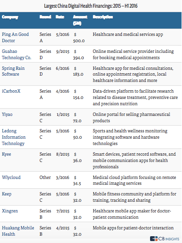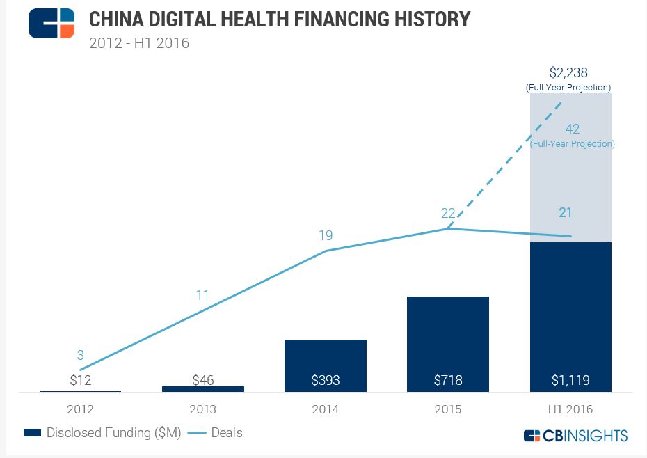 Китайские инвесторы установили рекорд, вложив в первой половине 2016 года около $1.1 млрд в стартапы, связанные с цифровой медициной, сообщает аналитическая компания CB Insights. За этот период были заключены 21 инвестиционная сделка с молодыми компаниями, работающими, в частности, в сфере мобильного фитнеса, взаимодействий пациент-врач и онлайновых аптек.