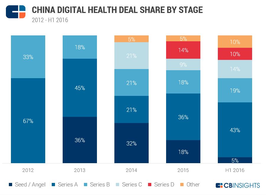 По мере того, китайский рынок цифровой медицины привлекает все больше финансирования, увеличивается и количество сделок на завершающих этапах разработок. В 2013 году примерно 36% сделок, связанных с цифровой медициной в Китае, относились к инвестициям на самом раннем этапе развития компаний-стартапов. В 2016 году - это уже только 5% инвестиционной активности. В начала 2015 года больше всего инвестиций делается в рамках раундов B и C, то на среднем этапе развития проектов. Например, это инвестиции в сообщество и платформу мобильного фитнеса KEEP, компанию Codoon, работающую в области мониторинга здоровья и активностей.
