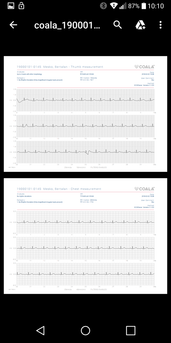 Компания разработала два варианта своего монитора сердечной деятельности - один для пациентов, второй, Coala Pro, для профессионалов. Последний предназначен для врачей и удаленного мониторинга пациентов. Устройство представляет собой комбинацию цифрового стетоскопа и высокопроизводительного ЭКГ-монитора. Этот небольшой прибор имеет три сенсора - один для измерений путем наложения устройства на грудь, а два других предназначены для больших пальцев рук, что позволяет сделать измерения достаточно точными. Т.е. пользователю необходимо просто приложить Coala к груди на 30 секунд, а затем еще 30 секунд провести вторые измерения, касаясь пальцами дополнительных сенсоров. Через минуту вы получает анализ работы сердца и скрининг на 10 различных сердечных патологий. Все результаты через Bluetooth переправляются в мобильное приложение и облачное хранилище, где к ним через портал Coala Care могут получить доступ врачи. Система выдает отчет непосредственно в приложении (упрощенный), либо его в профессиональном, подготовленном для врачей-кардиологов виде можно сгрузить в виде PDF-файла.