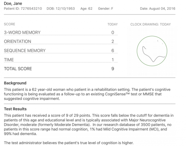 CogniSense представляет собой цифровую версию теста на ориентацию и память (Memory Orientation Screening Test), который был разработан в 2010 году и позволяет оценить способность воспроизвести последовательность из трех слов, ориентацию пациента во времени (знание им года, времени года, даты и дня), последовательную память (например, продуктовый список из 12 пунктов) и осознание времени. Это простой в использовании тест на определение когнитивной функции пациента, которые рекомендуют применять при ежегодном визите к врачу пожилых пациентов.
