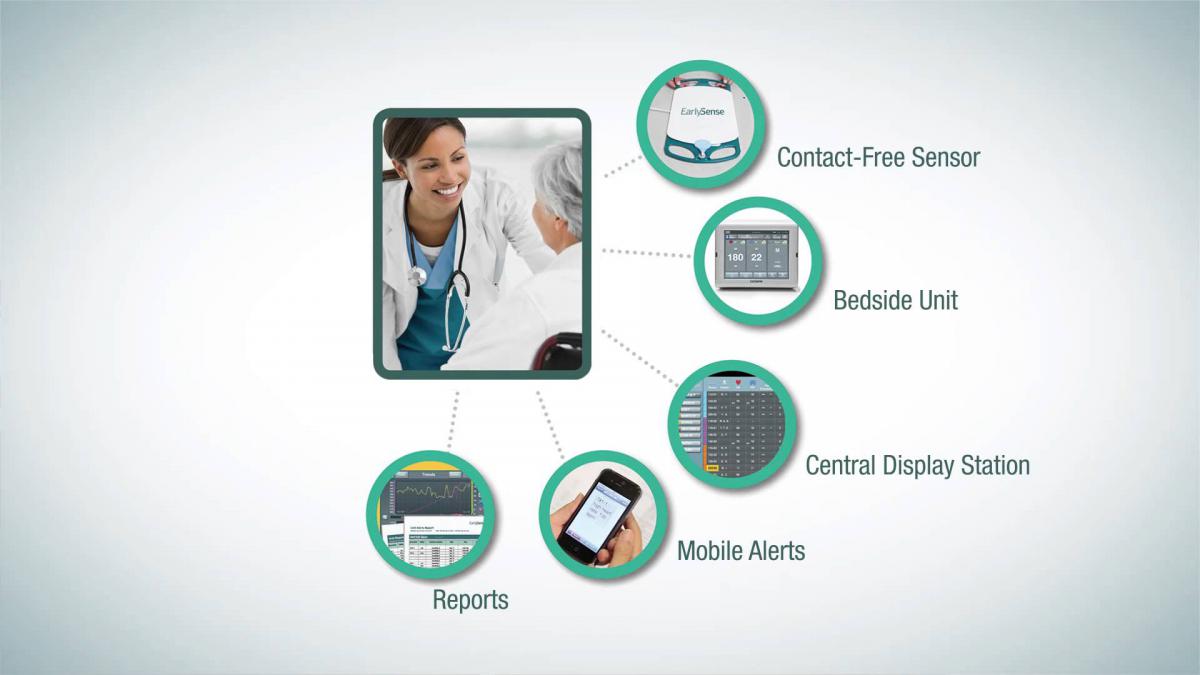 Такие системы используются для мониторинга частоты сердцебиения и дыхания, а также других показателей здоровья и характеристик движения пациентов. В состав решения входят такие технологические компоненты, как сенсоры, помещаемые под матрас или подушку кресла пациентов, прикроватный монитор, центральная контрольная станция и портативные (мобильные) медицинские устройства. Эти сенсоры измеряют вибрацию и рассчитывают параметры движения, контролируют показатели здоровья и обнаруживают любые отклонения параметров здоровья от базовых (нормальных). И, если статус здоровья пациента изменился, такая система немедленно информирует медсестру с помощью сигналов на большом мониторе центральной контрольной станции, а также мобильных устройств.