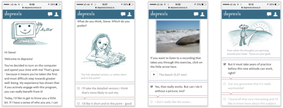 Deprexis - это веб-сайт, предназначенный как для пациентов, так и для медицинских специалистов, представляет собой что-то вроде игры "Выбери свое собственное приключение" со смоделированными диалогами. Во время игры пациент может выбирать различные варианты ответов при диалоге с системой. Эти диалоги базируются на когнитивно-поведенческих технологиях, включая когнитивную реструктуризацию, поведенческую активацию, разрешение проблем, а также принятие проблемы и ее безоценочное осознавание*.