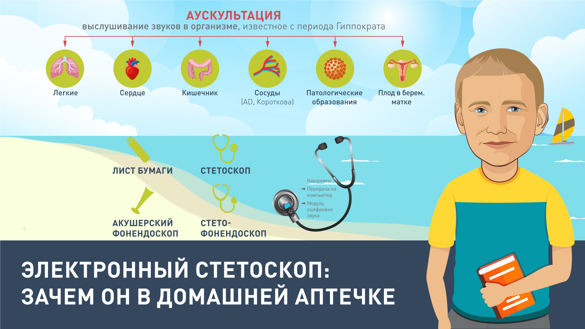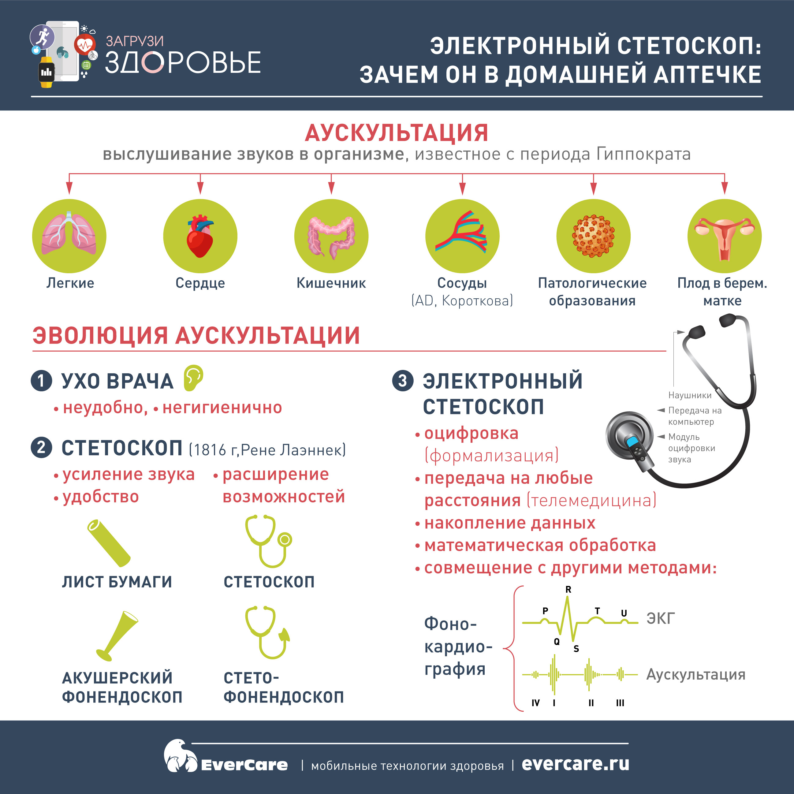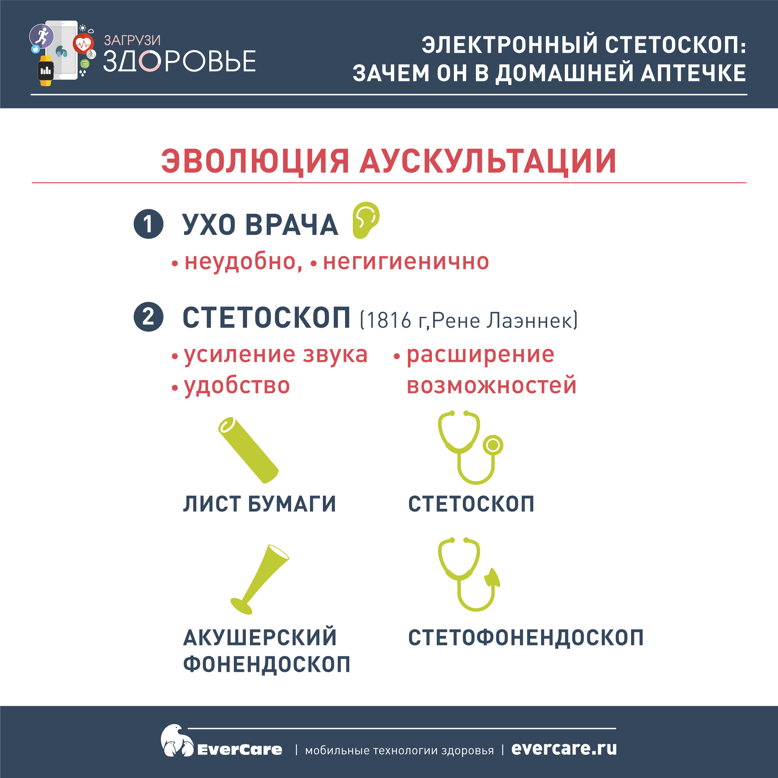 Таким образом, в ходе эволюции наш пациент все больше и больше отодвигается от врача. Сначала врач прям был рядом с пациентом, ухом прям слушал его, потом появился классический стетоскоп, а теперь появился и электронный стетофонендоскоп, с помощью которого вообще врач может находиться совершенно на бесконечно далеком расстоянии от своего пациента. И это открывает огромную возможность для того, чтобы использовать метод аускультации уже в домашних условиях. Собственно говоря, для этого такой инструмент, очень неложный, очень недорогой, может оказаться в домашней аптечке у наших пациентов.