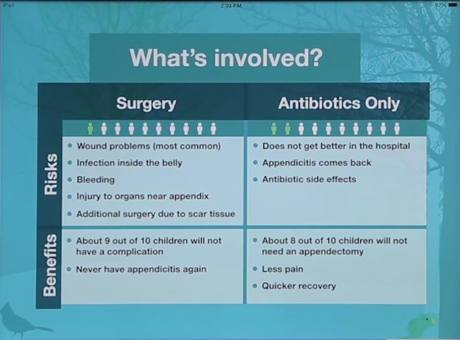 Крупнейшие американские медицинские учреждения - клиника Мейо* и Национальная детская больница* - разработали приложения, предназначенные для помощи врачам и родителям в принятии решений в отношении лечения. Первое приложение, принадлежащее клинике Мейо - Chest Pain Choice, появилась как результат сотрудничества с пациентской консультативной группой (patient advisory group). Оно содержит сведения о всех возможны диагнозах в этой области (боли в груди), список вариантов лечения и позволяет обсуждать риски. Согласно недавно опубликованным данным, приложение помогло больнице несколько уменьшить количество избыточных анализов и тестов.