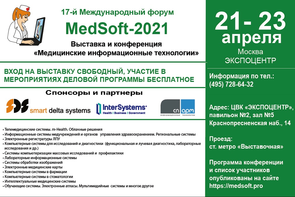 17-й Международный форум "MedSoft-2021" Выставка и конференция по цифровому здравоохранению пройдет 21 – 23 апреля 2021 по адресу: г.Москва. Центральный выставочный комплекс «ЭКСПОЦЕНТР». Павильон №2, зал №5