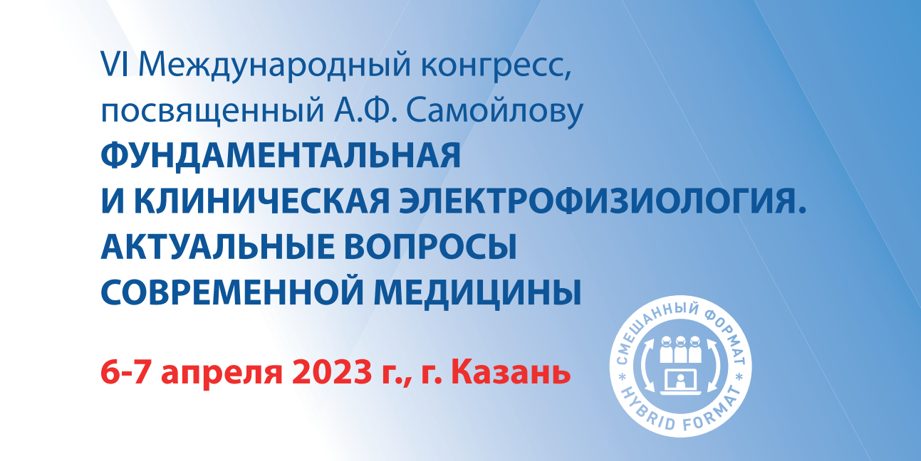 VI Международный конгресс, посвященный А.Ф. Самойлову «Фундаментальная и клиническая электрофизиология. Актуальные вопросы современной медицины» состоится 6-7 апреля 2023 г. в г. Казань. Место проведения - Казанская Государственная Медицинская Академия (Казань, ул. Бутлерова 36).