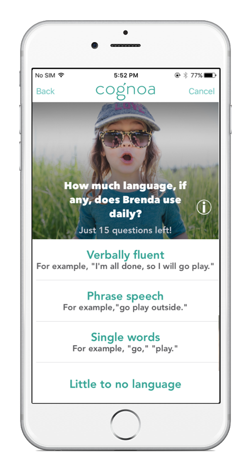 Приложение Cognoa помогает определить, не проявляются ли у ребенка признаки аутизма, задавая родителям ряд вопросов о поведении их малыша. Поведенческий алгоритм использует отчеты родителей и видео-оценку их ребенка. Все данные отсылаются специалисту и через три дня родители могут получить точную оценку и рекомендации к дальнейшим действиям. Видео необходимо для того, чтобы врачи могли посмотреть на ребенка и послушать его речь. Все данные и видео в защищенном и обезличенном виде хранятся в облачном хранилище.