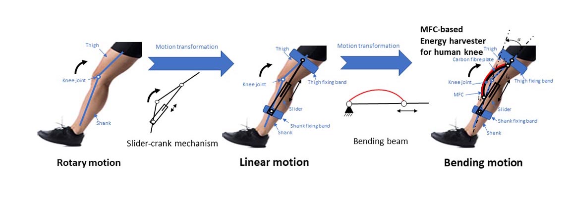 Исследователи использовали специальный макроволоконный материал, который генерирует энергию из любого изгиба, чтобы создать кривошипно-ползунный механизм, похожий на те, что применяются в машиностроении. Авторы решили прикрепить устройство к колену из-за большой подвижности коленного сустава по сравнению с большинством других человеческих суставов.