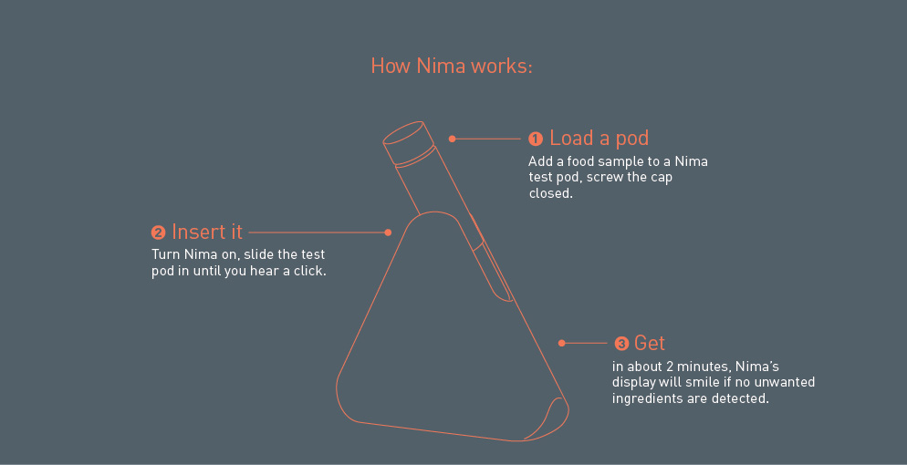 Все, что пользователю нужно сделать, это поместить образец пищи в одноразовую капсулу и закрыть ее крышкой. Затем эта миниатюрная капсула помещается в сенсор, который включается нажатием кнопки. Если пища содержит глютен, то на дисплее Nima появится маленькая печальная рожица голубого цвета. Если глютен отсутствует, то вы увидите счастливую рожицу. Сенсор сможет обнаружить наличие глютена, даже если он содержится в пище в количестве минимум 20 частей на миллион, что соответствует требованиям американских регулирующих органов к безглютеновым продуктам.