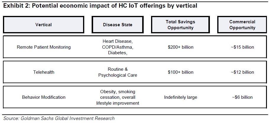 В самом ближайшем будущем Goldman Sachs оценивает рынок IoT в здравоохранении в $32,4 млрд, 45% которого будет связано с удаленным мониторингом больных и лечением хронических заболеваний, 37% с телемедициной и 18% с системами модификации поведения.