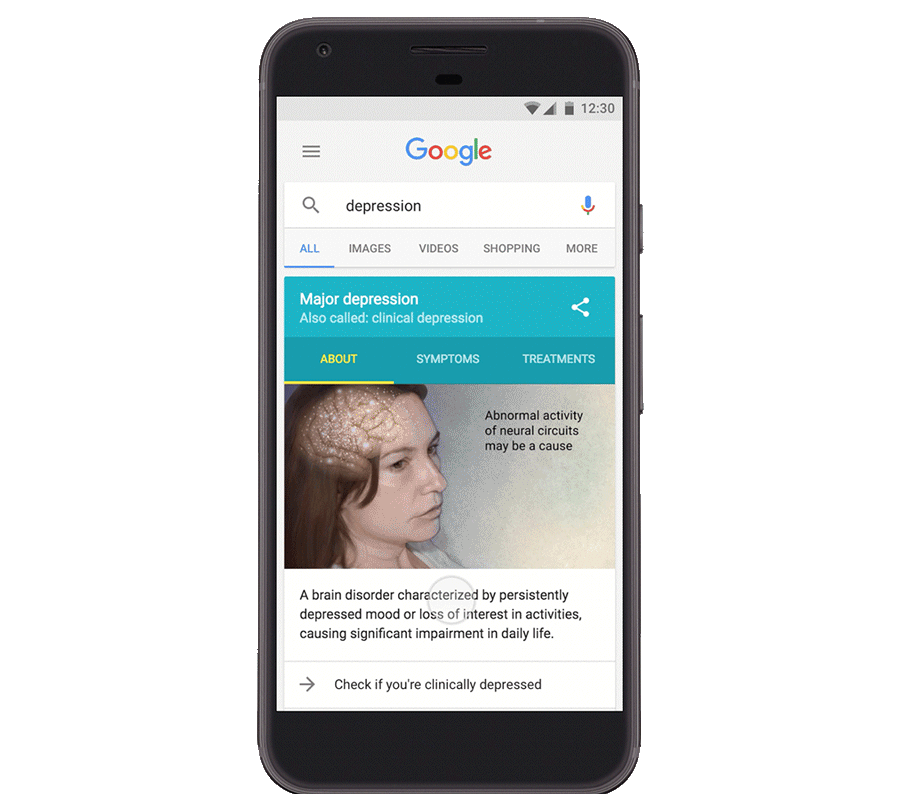 Компания создала специальный сервис, который появляется на экране, когда вы делаете запрос в поисковике Google со словами "депрессия" или клиническая депрессия". Он позволяет пользователю определить, есть ли у него депрессия и предлагает, где он может поискать лечение для нее. Правда, такая функция работает только в мобильных устройствах и только в США.