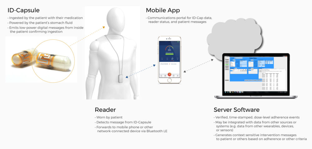 Одно из таких решений, разработанное американской компанией etectRx и получившее название ID-Cap, сейчас проходит клинические испытания. Оно представляет собой капсулы с лекарством, которые содержат внутри себя миниатюрное электронное содержимое и химические агенты, обеспечивающие своевременное высвобождение лекарства в желудке и выдачу наружу сигнала с информацией об этом. Когда капсула растворяется в желудке и выделяет лекарство, оно посылает очень слабый радиосигнал, который получает небольшое считывающее устройство, которое пациент носит с собой. Этот ридер затем с помощью Bluetooth отправляет соответствующее сообщение в специальное приложение на смартфоне пациента. Приложение, в свою очередь, информирует о приеме лекарства врача пациента, отсылая данные в облачную платформу управления информацией. Питание электроника капсулы получает за счет взаимодействия с жидкостью, содержащейся в желудке, двух инертных материалов в капсуле. Этого вполне достаточно, чтобы отослать единичный сигнал о том, что лекарство поглощено.