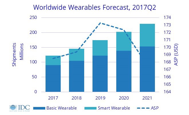 По прогнозам IDC, общие отгрузки носимых устройств всех производителей составят в этом году 121.7 млн шт., что на 16.6% больше, чем аналогичный показатель предыдущего года (104.4 млн шт.). Рынок продолжит расти в следующие несколько лет, при этом отгрузки в 2021 году достигнут 229.5 млн шт. Это означает, что среднегодовой рост за этот период составит 17.2%.