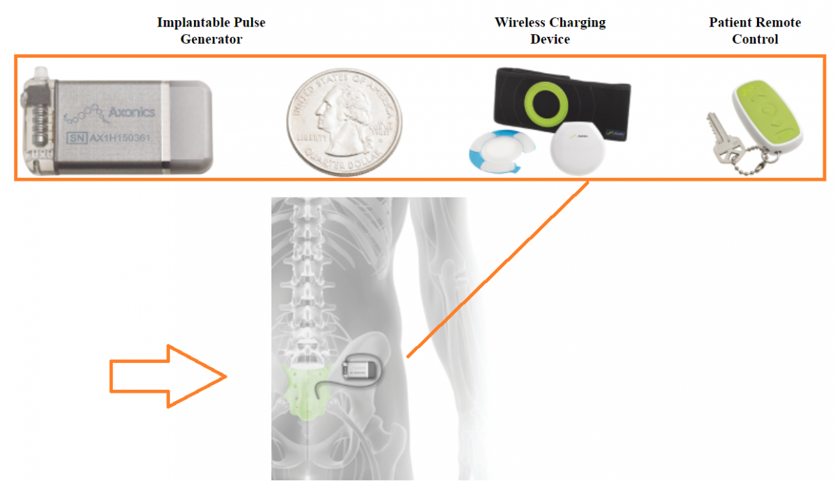 Это устройство, согласно данным производителя, имеет "срок жизни" порядка 15 лет, что в три раза больше, чем может работать любое другое аналогичное устройство. Это связано с тем, что имплантат компании Axonics размером примерно с USB-накопитель может перезаряжаться непосредственно через кожу без необходимости его извлечения, в отличие от подобных устройств, которые необходимо извлекать для замены батарей. Кроме того, прибор Axonics на 60% меньше, чем конкурентные системы.
