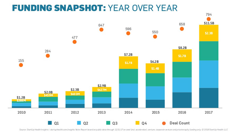 Компания StartUp Health выпустила очередной отчет, показывающий, что инвестиции в компании, работающие в сфере цифрового здравоохранения, составили в 2017 году $11.5 млрд, что на $3.5 млрд больше, чем в 2016 году.