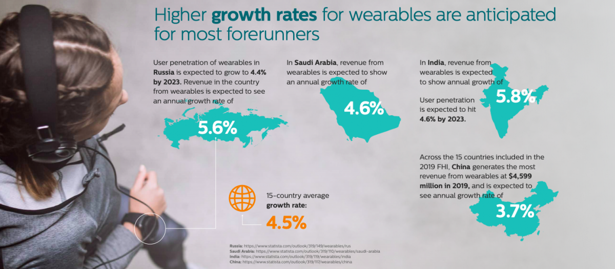 Что касается носимых устройств, то Индия лидирует среди 15 стран мира по уровню дохода от продаж этих продуктов, который, как ожидается, будет ежегодно увеличиваться на 5,8% по сравнению с 4,5% во всем мире.