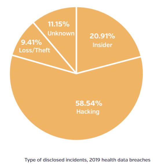 Большинство проникновений происходило в сетях медицинских организаций (72%), причем в основном были взломаны системы электронных медицинских карт, а хищение медицинской информации с бумажных носителей составляло всего 12%.