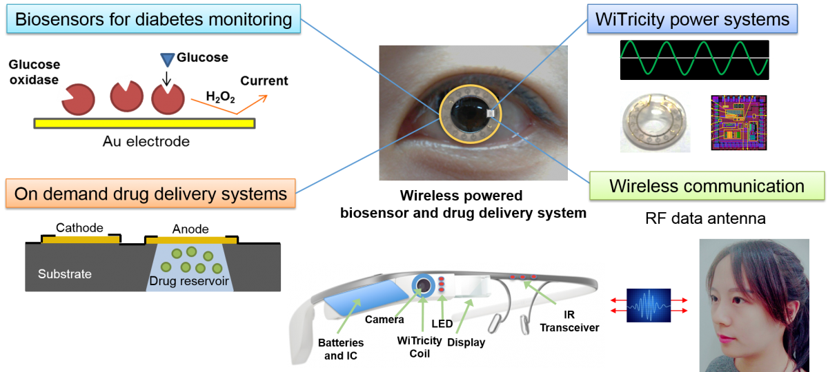 Ученые корейского Пхоханского университета науки и технологии разработали комбинацию очков и контактных линз, основная задача которой отслеживать уровень сахара в крови владельца устройства и при необходимости вводить прямо в глаз лекарства. Питание очков осуществляется беспроводным способом, таким же способом они обмениваются данными с линзами, которые контролируют уровень сахара в слезной жидкости и способны выделять лекарства. Если уровень сахара превысит допустимые пределы, в очках начинает светиться встроенный светодиодный индикатор.