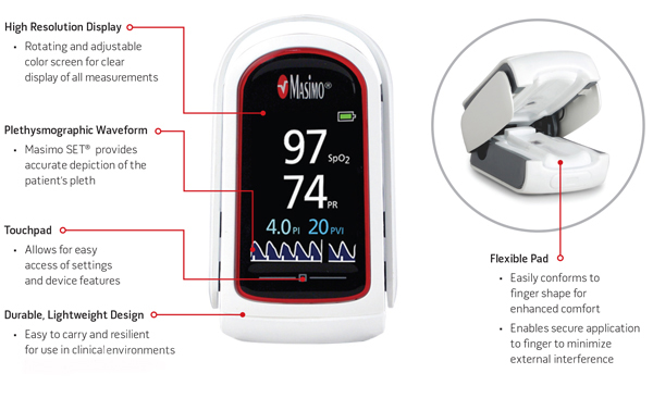 В продажу в США поступил сертифицированный FDA (U.S. Food and Drug Administration) портативный пальцевой пульсоксиметр Masimo MightySat Rx. Устройство использует те же технологии (Masimo SET), что и стационарные пульсоксиметры, которые используются в больницах по всему миру и применяются во всех прикроватных системах Masimo, как, впрочем, во многих мультипараметрических мониторах. MightySat неинвазивно измеряет артериальную насыщенность кислородом (SpO2) и частоту пульса, а также индекс перфузии и опционально индекс плетизмографической вариабельности (PVI, pleth variability index). Использование технологии SET обеспечивает точное измерение SpO2 и частоты пульса при движении пациента и низкой перфузии.