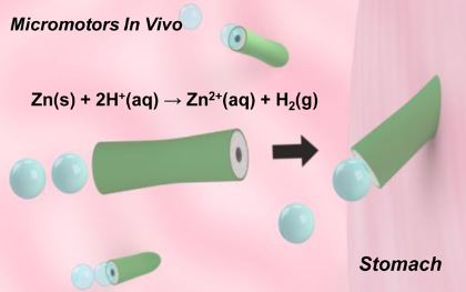 Наноботы двигаются как миниатюрные ракеты с помощью пузырьков газа, которые создаются за счет реакции с содержимым желудка, куда они помещаются (глотаются), и такой метод движения уже был успешно испытан на живых мышах. Трубчатые наноботы длиной примерно в 20 микрон и диаметром 5 микрон покрыты цинком, который взаимодействует с соляной кислотой в пищеварительной системе, образуя газ, который и является движителем миниатюрного устройства. Причем двигаются эти наноботы со скоростью до 60 мкм в секунду и способны самостоятельно внедряться в стенку желудка или кишечника, где остаются до 12 часов подряд. Там они растворяются и выделяют свое лекарственное содержимое непосредственно в ткань пищеварительной системы.
