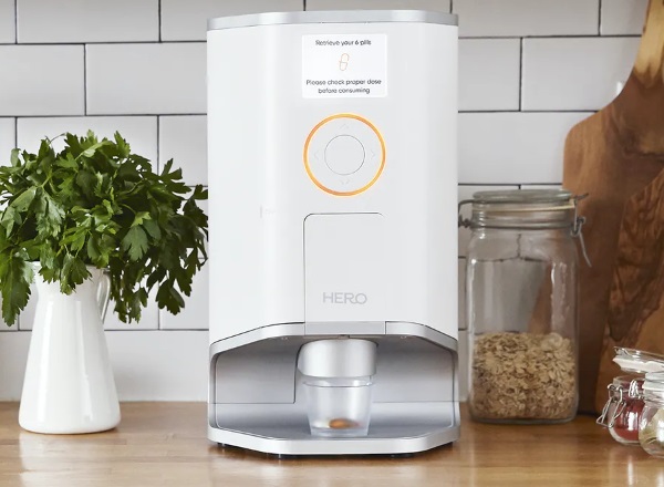 Система Hero представляет собой устройство, очень похожее на кофеварку, которое хранит, распределяет, отслеживает потребление и заказывает в аптеке лекарства (к сожалению, этот функционал для России не имеет смысла). Работающее совместно с этим прибором мобильное приложение контролирует режим приема пациентом лекарств, отсылает уведомления медицинскому специалисту или опекуну о лекарственных дозах, а также отслеживает соблюдение временных параметров медикаментозного режима. Пользователи могут загрузить в диспенсер до 10 различных видов таблеток, которые машина автоматически высыпает в чашку в нужных комбинациях в нужное время. В ней есть датчик, который может определить, когда таблетки находятся в чашке, поэтому она знает, когда вы вынули таблетки из машины, и может отправить эту информацию в соответствующее приложение.
