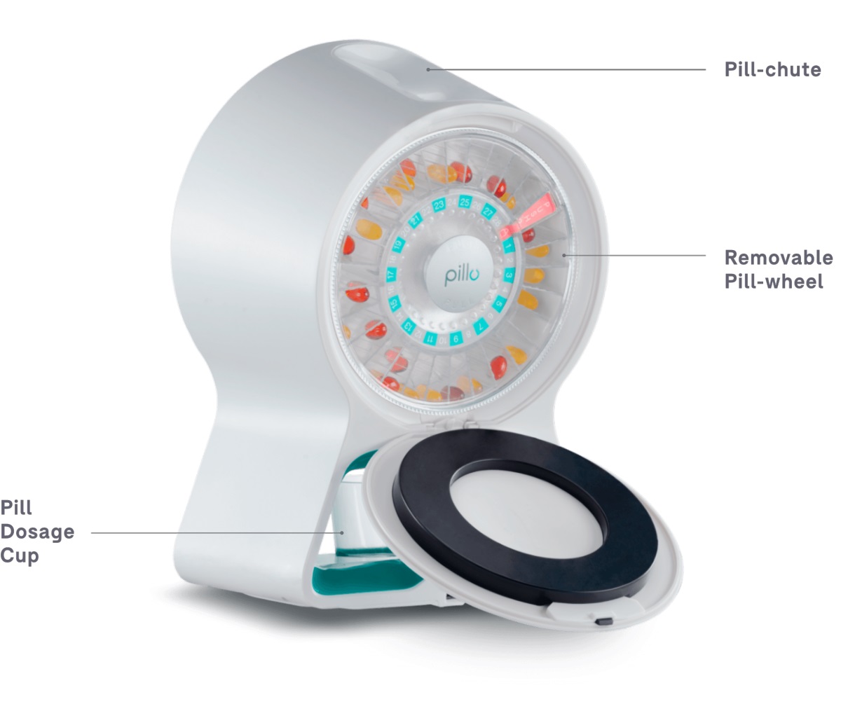 Этот относительно дорогой прибор, разработанный для пожилых пациентов и людей с хроническими болезнями и сложным планом лечения, представляет собой автоматизированный диспенсер лекарств, который способен дополнительно оказывать персонализированную поддержку своему пользователю. Pillo может хранить, выдавать и заказывать до 28 доз лекарственных препаратов в соответствии с заранее установленным графиком. Кроме того, прибор использует голосовые команды и программу на базе искусственного интеллекта, чтобы помогать пациенту и напоминать ему о необходимости соблюдения плана лечения. Это устройство может также предоставлять медицинскую информацию в виде аудио- и видео-контента, обеспечивать видеозвонки пациента своему врачу или опекуну через встроенный в него круглый дисплей.