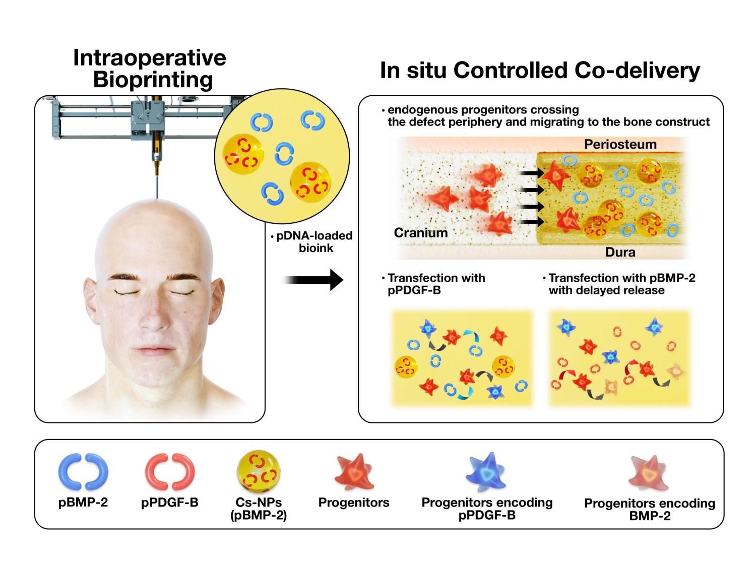 Ученые из Пенсильванского университета (США) разработали метод печати "костной" конструкции во время хирургической операции. Этот метод предназначен для того, чтобы позволить хирургам быстро заполнять костные дефекты, которые нелегко заживают сами по себе, и исследователи ускорили этот процесс, включив в него гены, способствующие формированию костной ткани. Соответственно, они называют полученную печатную биоконструкцию "генно-активированной матрицей". Гены включают фактор роста тромбоцитов (PDGF-B), который стимулирует близлежащие клетки к вторжению и пролиферации внутри конструкции, и костный морфогенетический белок (BMP-2), который стимулирует формирование кости. Этот метод может обеспечить продолжительное заживление, поскольку гены экспрессируются клетками внутри конструкции в течение длительного времени.
