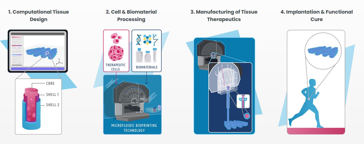 Платформа биопечати Aspect — это, по сути, 3D-принтер для тканевой терапии. Ученые сначала используют программное обеспечение Aspect для проектирования тканей с целью борьбы с корневыми причинами заболевания — путем замены, восстановления или увеличения существующих клеточных процессов в организме. После этого принтер объединяет терапевтические клетки и другие биоматериалы в "биочернила" для производства новых тканей, которые могут быть имплантированы хирургическим путем.