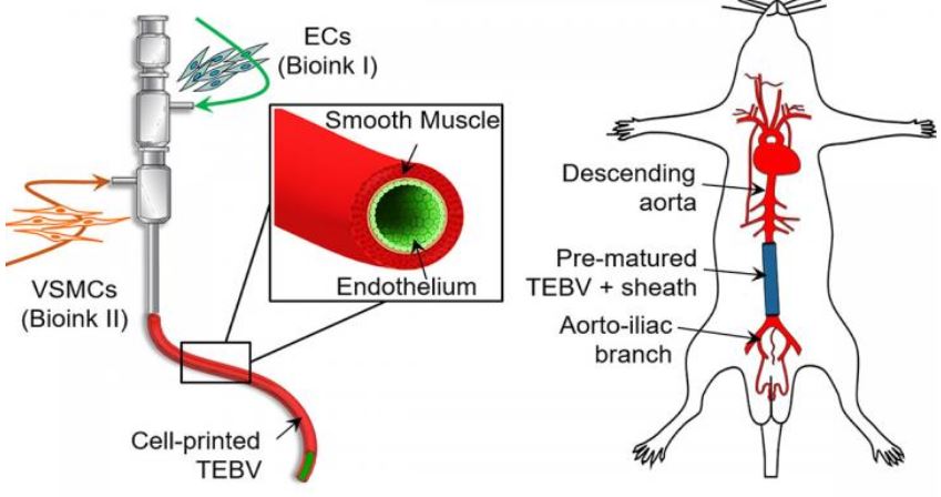 В свою очередь корейские инженеры с помощью 3D-печати создали "встраиваемые" кровеносные сосуды и успешно имплантировали их крысе. С помощью этого процесса они надеются разработать функционирующие искусственные кровеносные сосуды, необходимые для лечения сердечно-сосудистых заболеваний.