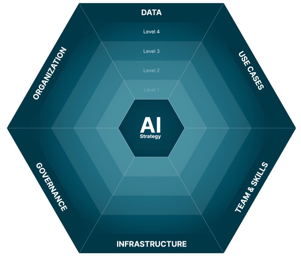 Такая система разработки стратегии AI состоит из шести различных измерений. В рамках каждого измерения компания имеет соответствующий уровень зрелости, варьирующийся от 1 до 4. Эта зрелость оценивается перед разработкой стратегии.